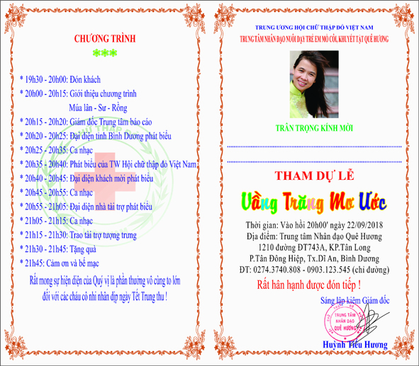 Trung tâm Nhân đạo Quê Hương trân trọng kính mới Quý ân nhân xa gần, Quý Công ty đến tham dự chương trình vào lúc: 19h30 ngày 22 tháng 09 năm 2018