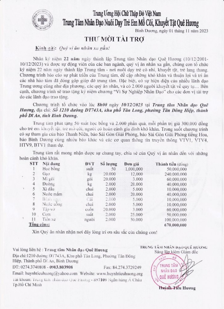 THƯ MỜI TÀI TRỢ CHƯƠNG TRÌNH LỄ KỶ NIỆM THÀNH LẬP 22 NĂM MÁI NHÀ TRUNG TÂM NHÂN ĐẠO QUÊ HƯƠNG (10/10/2001-10/12/2023)